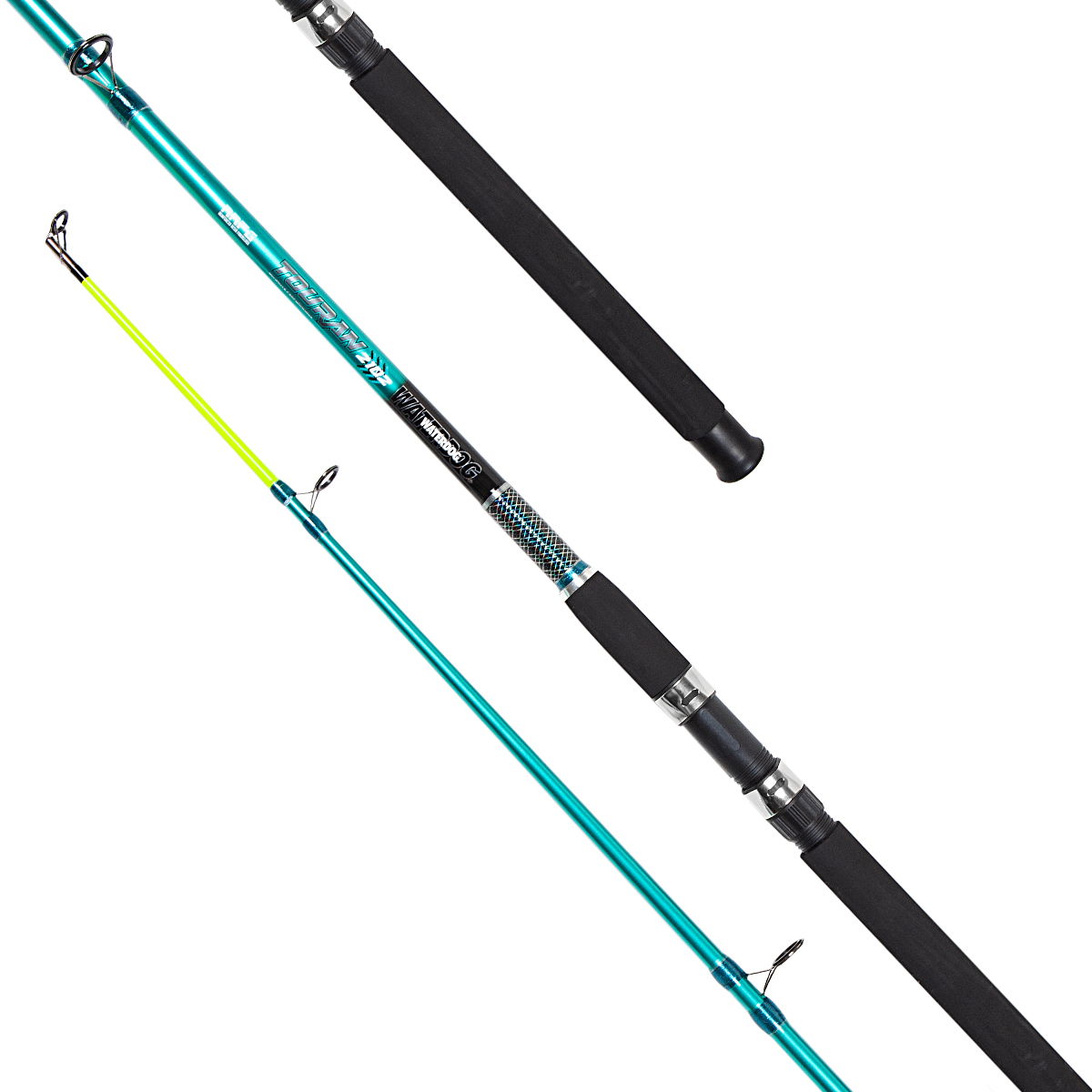 Caña de dos tramos Waterdog Touran. Modalidad de pesca: Variada. Largo caña: 2,70 m. Composición: FIBRA DE VIDRIO Para Plomada: 100 a 200 g Pasahilos: Cerámica. Porta Reel: Grafito a rosca. Empuñadura: Polímero termoplástico antideslizante Sugerida para: Tarari - Carpa - Corvina - Brótola.