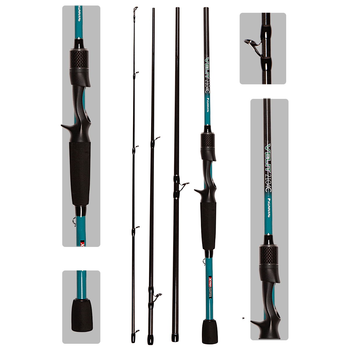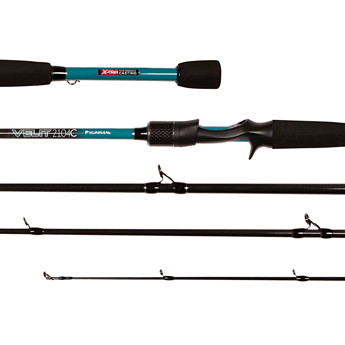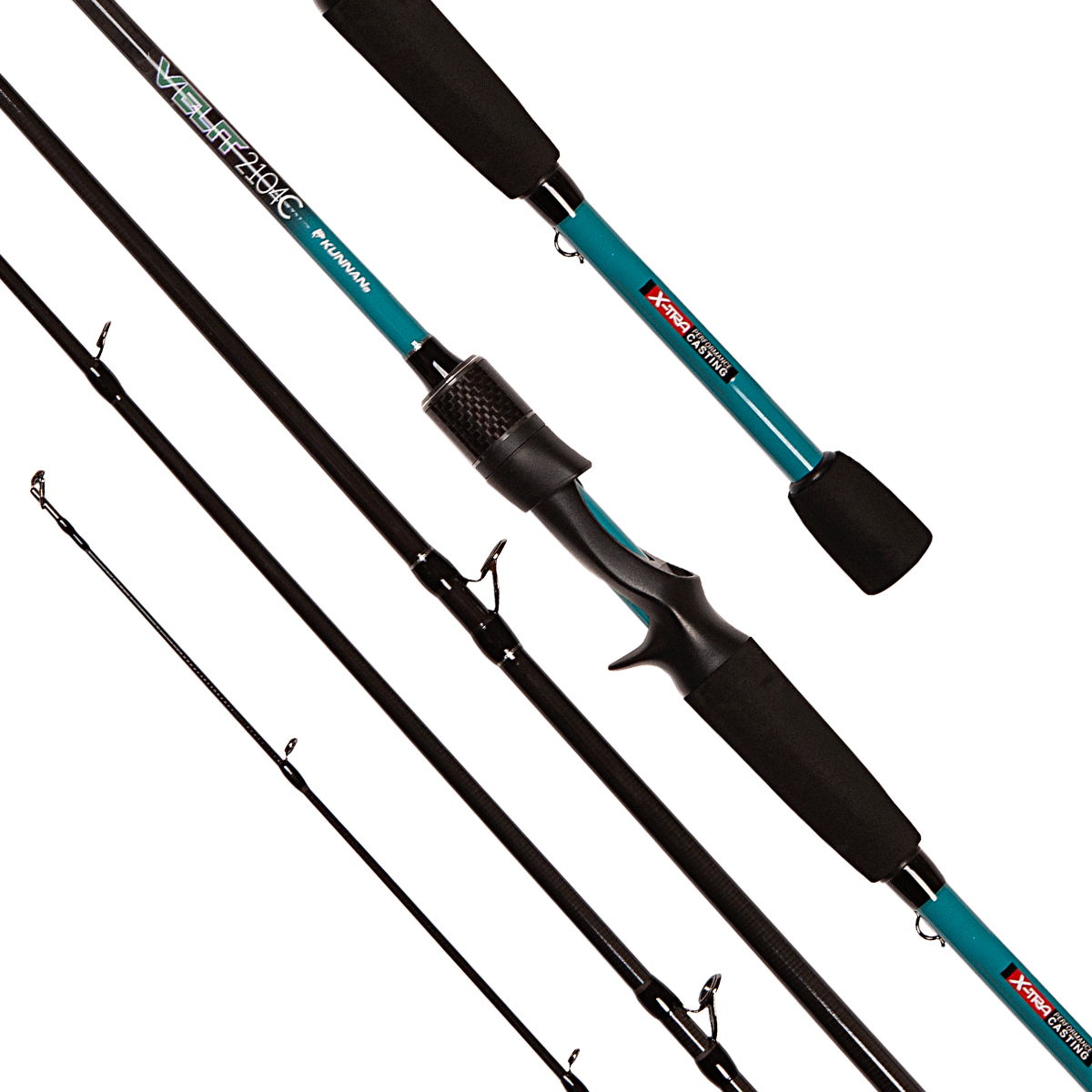 Caña de 4 tramos Kunnan Velit. Modalidad de pesca: Baitcasting. Composición: LRC CARBON. Cast weight: 6 a 14 lbs. Pasahilos: Titanio cromo niquel. Porta Reel: Grafito a rosca con gatillo. Empuñadura: Polímero termoplástico antideslizante. Hook keeper. Sugerida para: Pacú - Surubí - Dorado - Tararira.